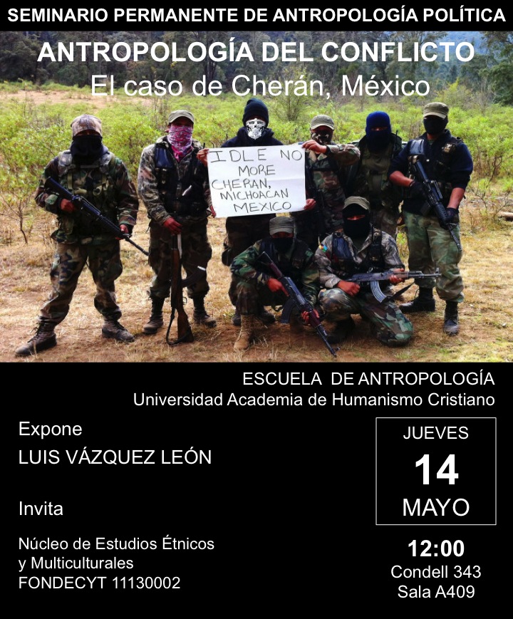Afiche de Presentación. Exposición a cargo de Luis Vázquez León, sobre Antropología del Conflicto, el caso de Cherán, México. Actividad realizada el jueves 14 de mayo de 2015 a las 12:00 horas. Sala A409, Sede Condell, Universidad Academia de Humanismo Cristiano.