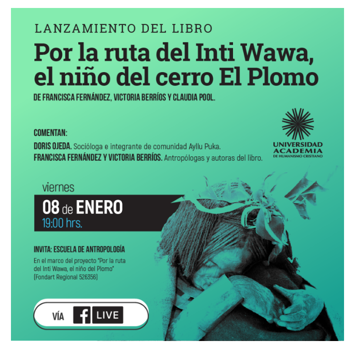 Lanzamiento del libro de las autoras y antropólogas Francisca Fernández Droguett, Victoria Berríos y Claudia Pool. Participan comentando dos de las autoras, Francisca Fernández y Victoria Berríos, junto a Doris Ojeda, socióloga e integrante de la comunidad Ayllu Puka. Actividad reallizada el 8 de enero a las 19:00 hrs. Presentación online, transmitido por la plataforma de Facebook Live de la Universidad Academia de Humanismo Cristiano.