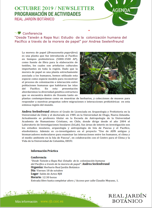 El Herbario Real Jardín Botánico Madrid, España, invita a la conferencia de la Dra. Andrea Seelenfreund, docente UAHC y directora del Laboratorio de Investigaciones Insulares (ISLab), titulada "Desde Taiwán a Rapa Nui: Estudio de la colonización humana del Pacífico a través de la morera de papel", en la cual explica la vinculación del uso de esta fibra en textiles en la reconstrucción de las interacciones entre sociedades isleñas del Pacífico. Actividad realizada el viernes 18 de octubre de 2019, a las 12:30 hrs. en el Salón de Actos Real jardín Botánico.