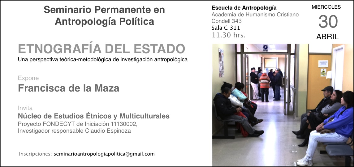 Afiche. Exposición de Francisca de la Maza titulada "Etnografía del Estado. Una Perspectiva teórico-metodológica de investigación antropológica", en el marco del Seminario Permanente en Antropología Política, organizada por el Núcleo de Estudios Étnicos y Multiculturales. Actividad realizada el miércoles 30 de abril de 2014, Sala C311, Universidad Academia de Humanismo Cristiano, sede Condell.